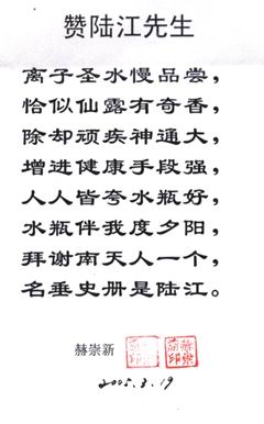 3. 詳細(xì)了解請(qǐng)上網(wǎng),可見臨床報(bào)告,鑒定證書、專家評(píng)說、治病機(jī)理、用戶反饋、題詞、詩(shī)歌、錦旗等彩色掃描件,被譽(yù)為"神奇水瓶"。