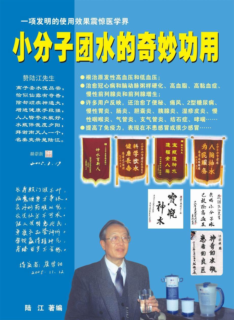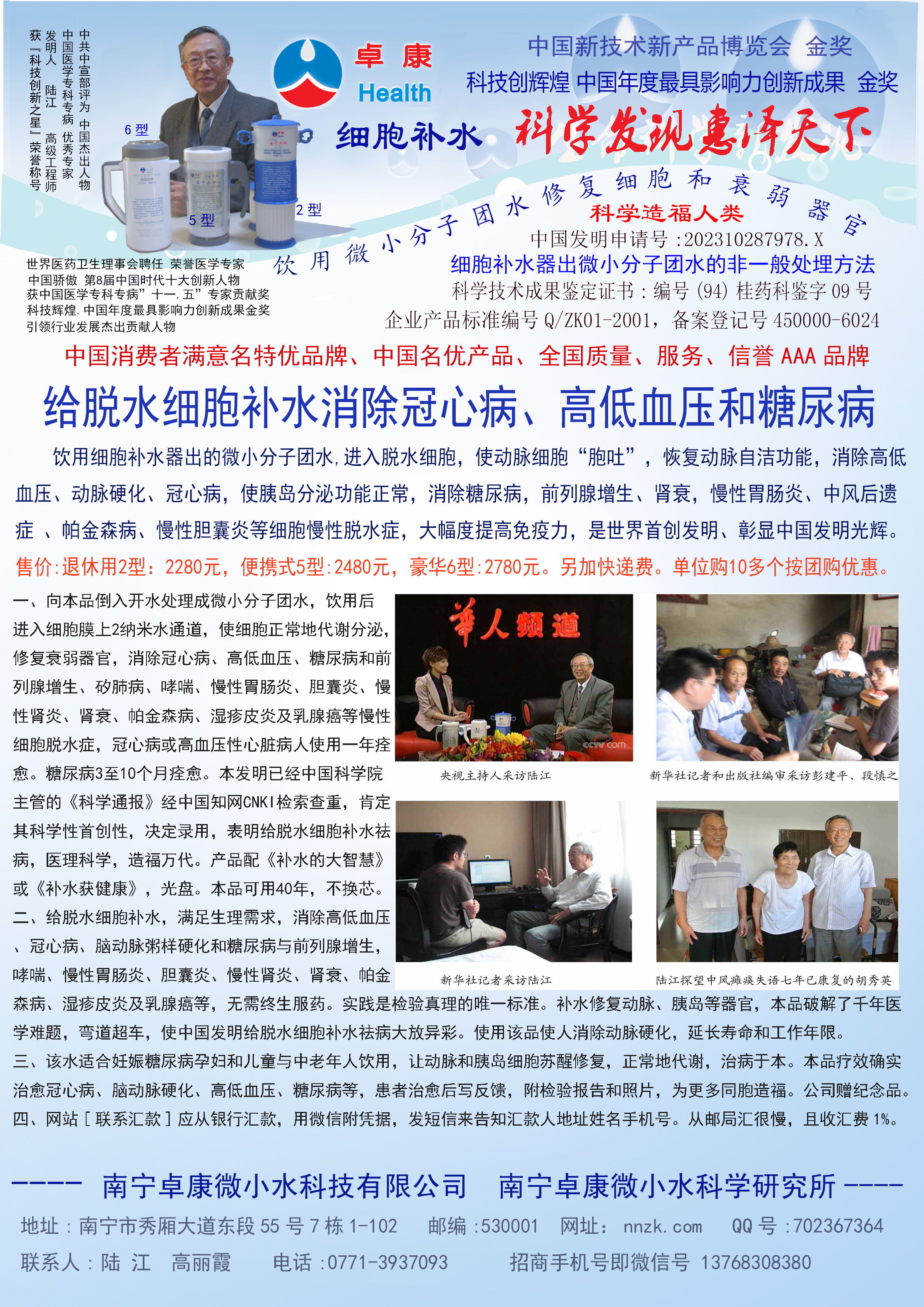 人類幾千年來(lái)患以上病癥需終生服藥,幾十年也不能治愈。可是我國(guó)南寧的高級(jí)工程師陸 江,于1990年想根治高血壓,研究發(fā)明了離子水瓶,處理出微小分子團(tuán)水供飲用,經(jīng)過醫(yī)院臨床試用和專家鑒定,1999年獲中國(guó)發(fā)明專利權(quán),產(chǎn)品于2000年投放市場(chǎng)后一直跟蹤調(diào)查,據(jù)全國(guó)各地用戶反饋:祛除了高低血壓、糖尿病和冠心病,并使前列腺增生、咽喉炎、鼻竇炎、慢性氣管炎、支氣管炎、矽肺病、哮喘、慢性胃炎、腸炎、慢性膽囊炎、慢性腎炎、腎衰、膀胱炎、便秘、痔瘡、風(fēng)濕性關(guān)節(jié)炎和濕疹皮炎及中風(fēng)后遺癥等病癥不藥而愈。為什么喝微小水能治20多種病?陸 江從1991年德國(guó)科學(xué)家發(fā)現(xiàn)細(xì)胞膜水通道僅為2納米獲得啟發(fā),認(rèn)為多種器官患病是因細(xì)胞脫水,不能正常代謝和分裂增殖,才使器官細(xì)胞減少致衰弱萎縮而形成細(xì)胞缺水性病癥。22年來(lái)的實(shí)踐有力地支持了“細(xì)胞脫水致病”這一重要論點(diǎn),表明喝微小水可滿足細(xì)胞的生理需求,補(bǔ)水就能祛病,是生命科學(xué)新亮點(diǎn)。